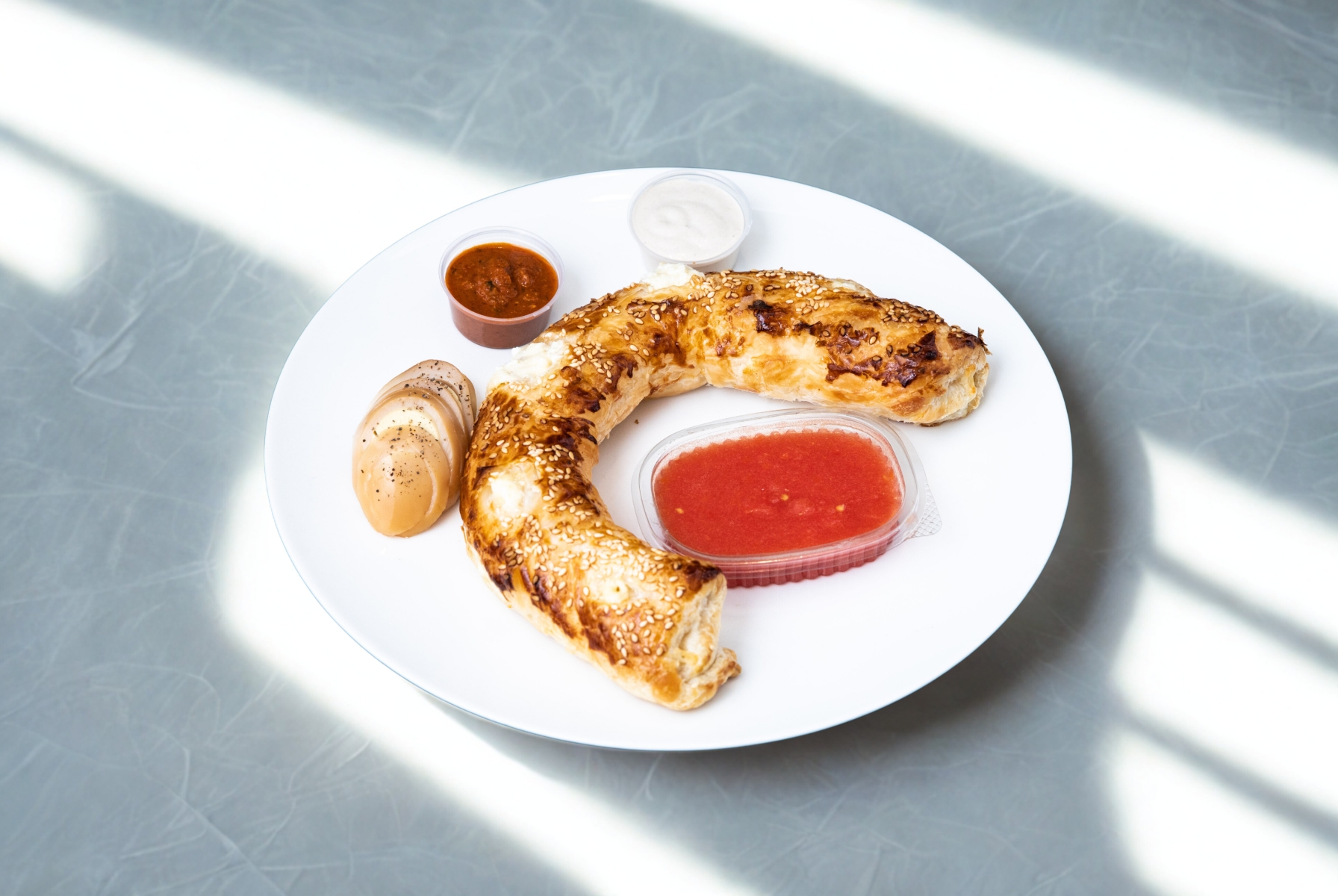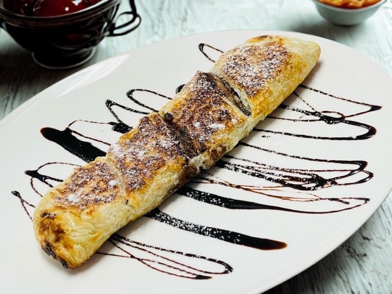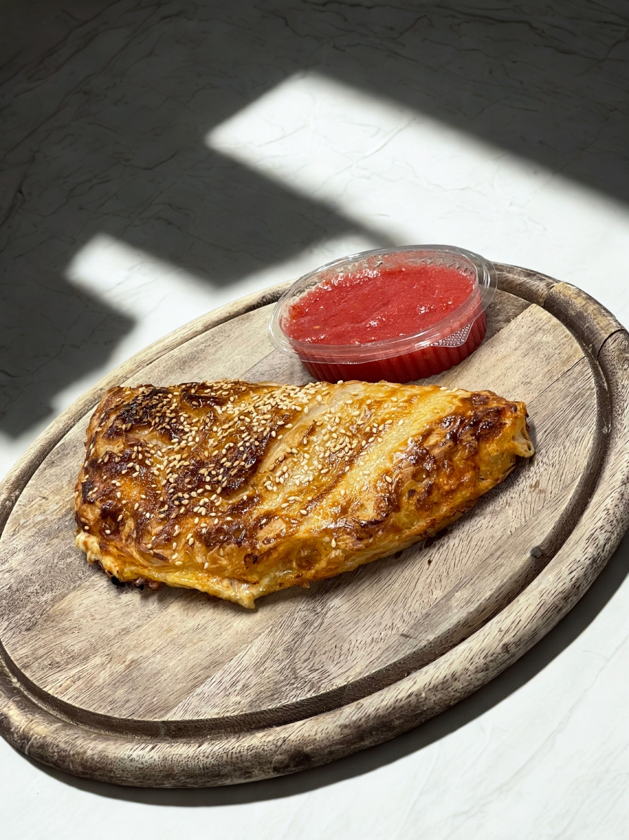 מאפה בצק עלים ממולא בגבינה צהובה רוטב פיצה ותוספות לבחירה
